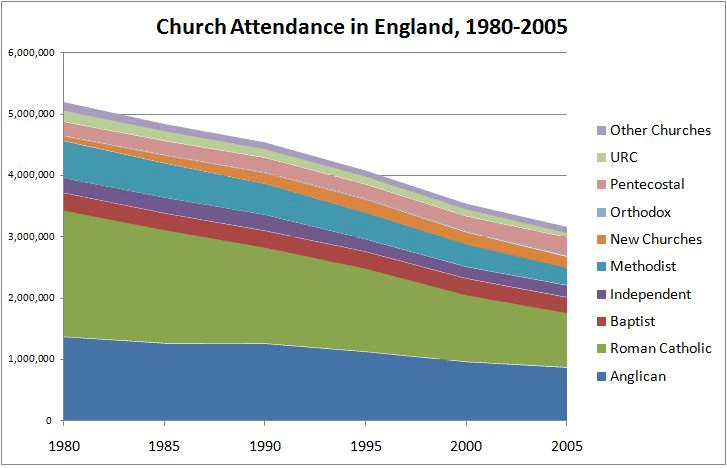Having said that, lets look at the stats a figures given to us by online data bases to get a grasp on this new age downfall of religious ideologies. According to The British Academy church attendance had dropped by 1.5 – 2 million since 1980 in England. Additionally a graph by the Faith Survey declares that attendance has quartered in Roman Catholics by 2015 and halved by Church of England attendees.