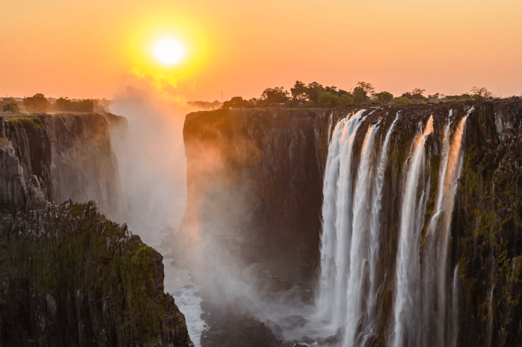 There is no greater sight in Zimbabwe than Victoria Falls. The water particles take a long voyage over the rocks of the great Zambezi River, rising up into the warm evenings hazing out the sun. Upon the approach to the worlds largest sheet of falling water the roar of millions of gallons of falling water can be heard from miles around. Sunsets bless each evening with a orange warmth. Animals graze on the shores of crystal lakes, casting puppet shadows on its water. Every animal you loved as a child while reading adventure books or watching national geographic spring from the grass lands. This is the garden of Eden.