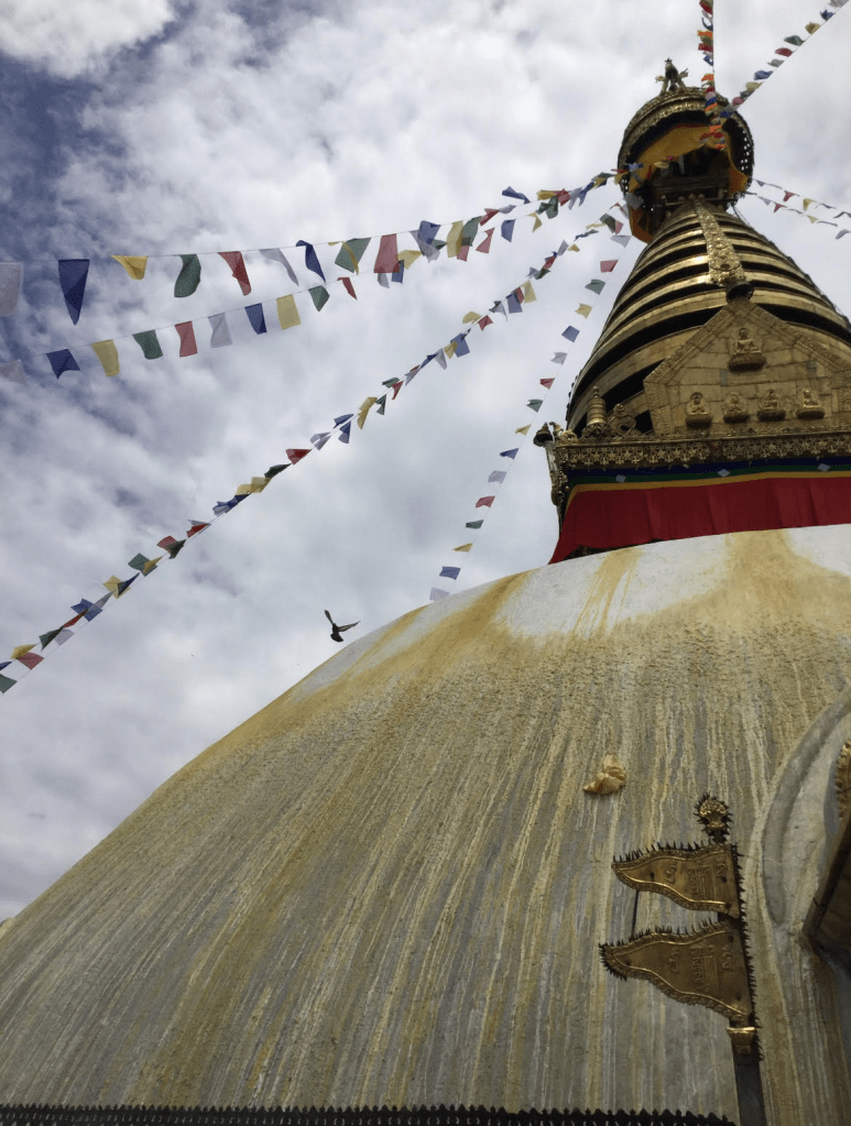 High upon a hillside, in the Western part of Kathmandu stands a white dome, adorned with a golden spire, draped in colourful prayer flags that flap frantically in the cool mountainous breeze.