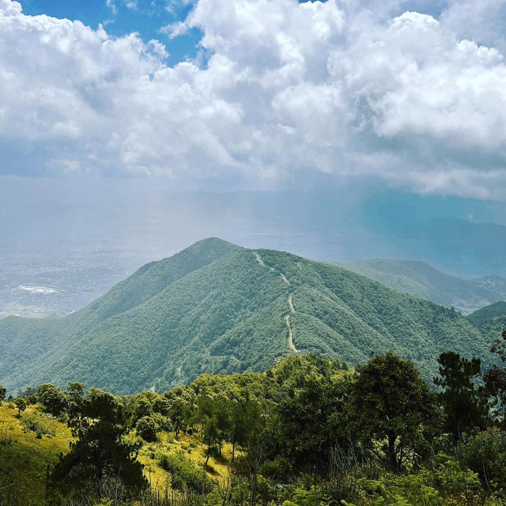 Soon enough you arrive on the hills ridgeline. Between the gaps in the dense treeline you can make out the vast city in the expanding valley below. Like a grey jungle of human life, it goes on and on and on into the horizon. Paths will start to direct into the one you walk on from the East, South and North, at any point, take one of these paths and return to the valley floor. But for the real rewards, continue up to Bhasmasur Hill.